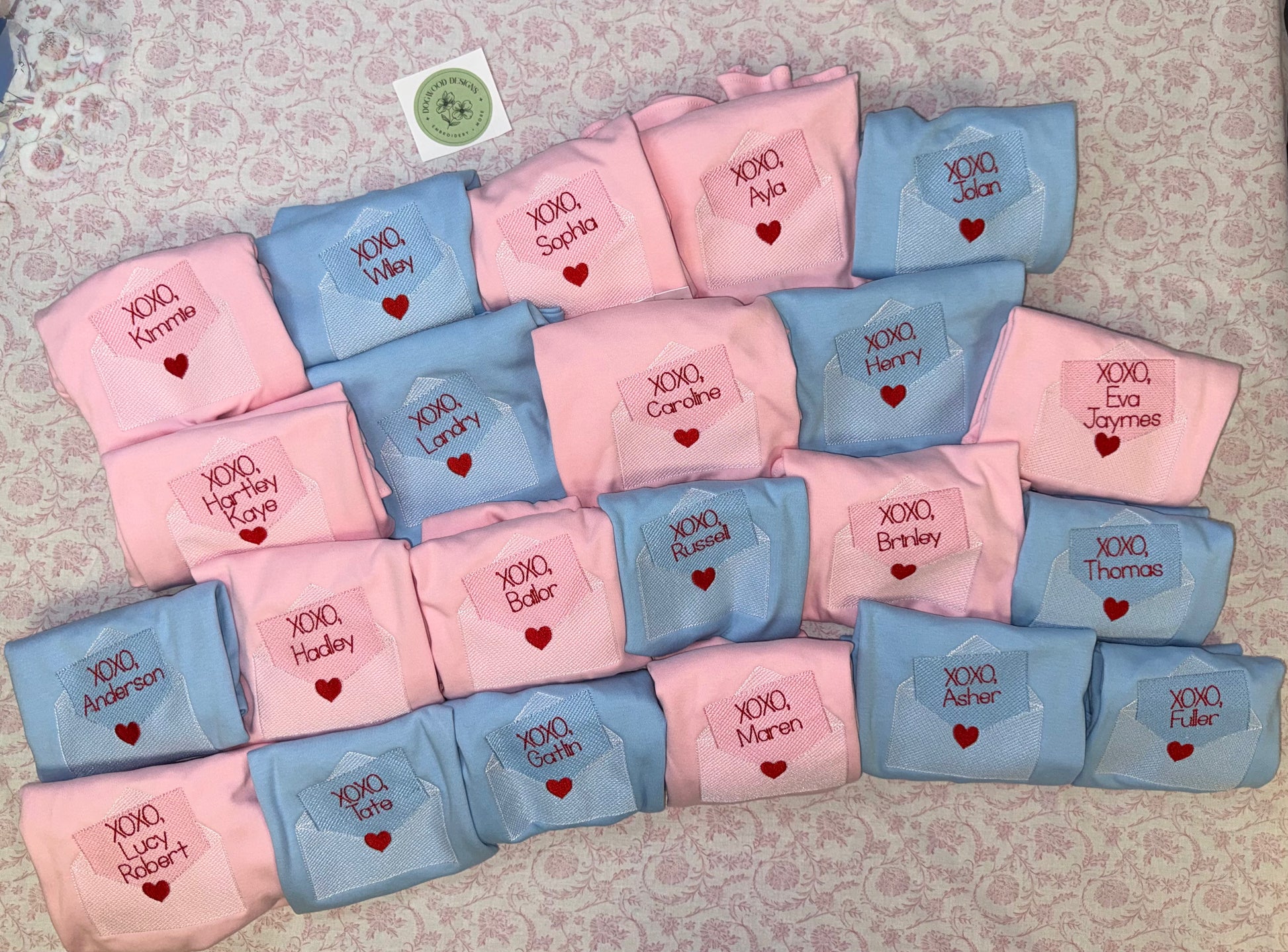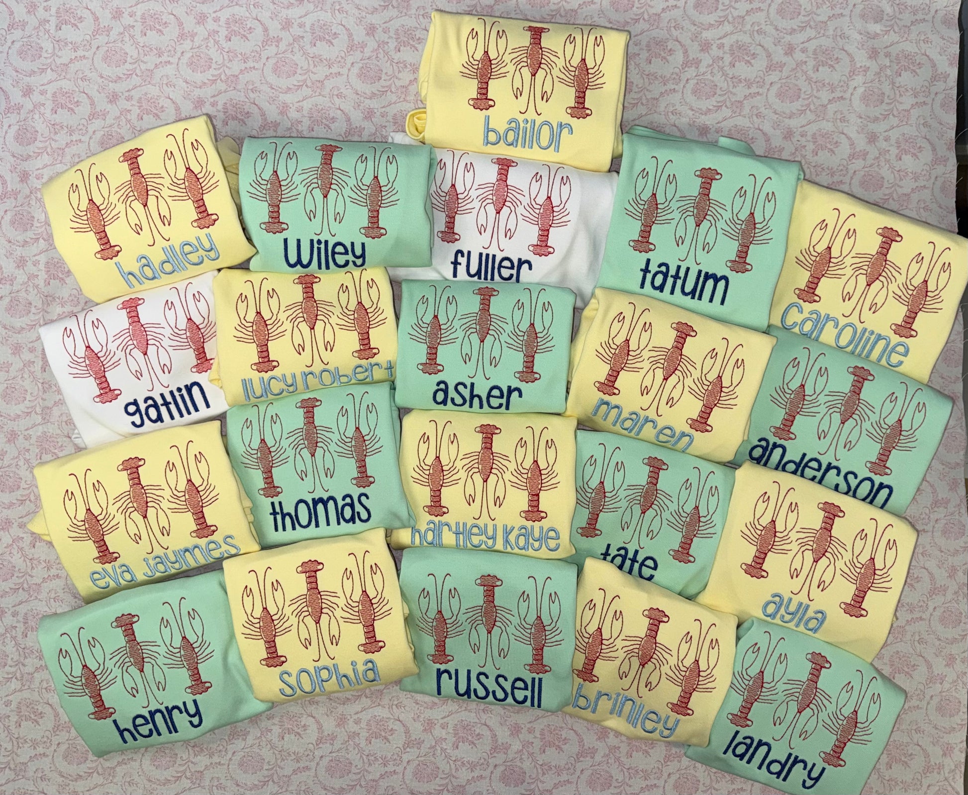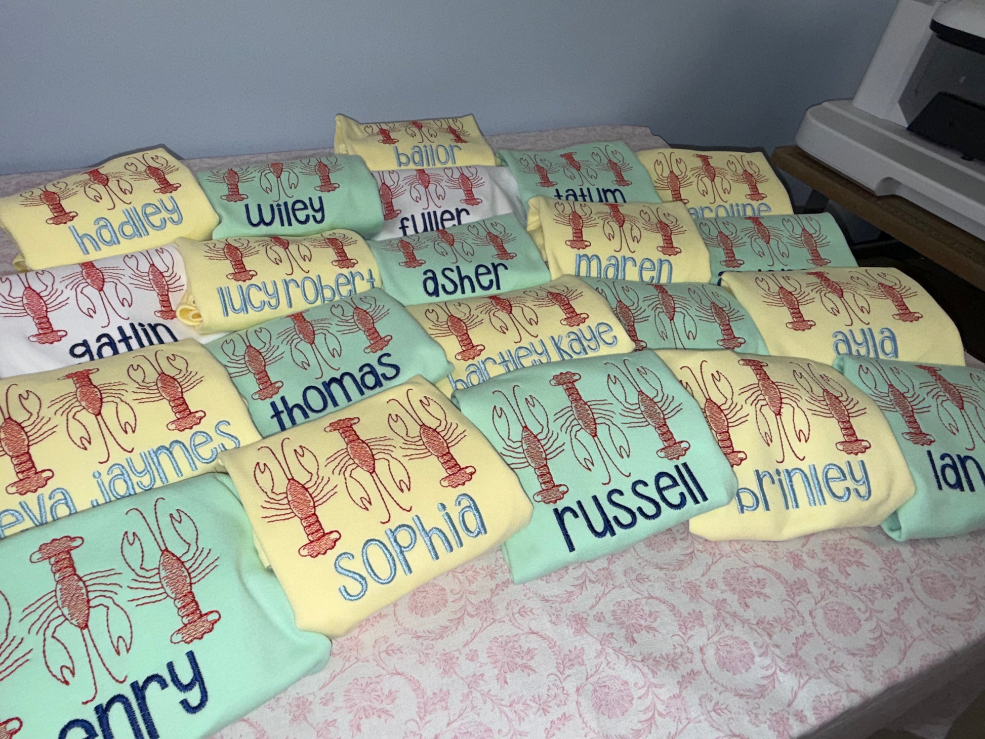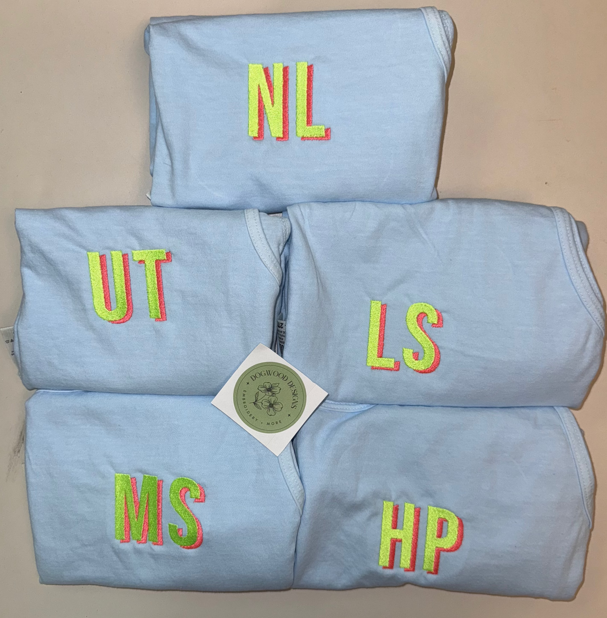 Most Drops will include a t-shirt, but others may feature a seasonal item like a towel, ornament, etc. All orders are custom embroidered at our warehouse in Vicksburg, MS. Seasonal designs may be included throughout the year. When applicable, these items will be delivered at least one month in advance to allow plenty of time for wear. I try my best to coordinate colors for siblings. Gowns and onesies will be white if the monthly color is not available.