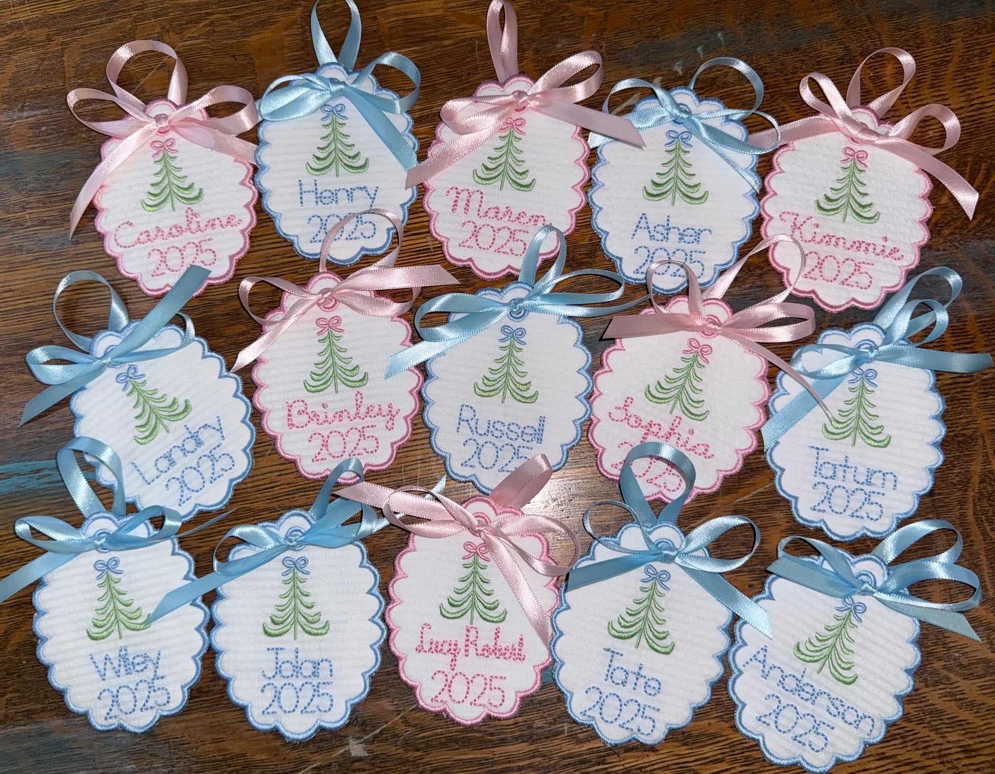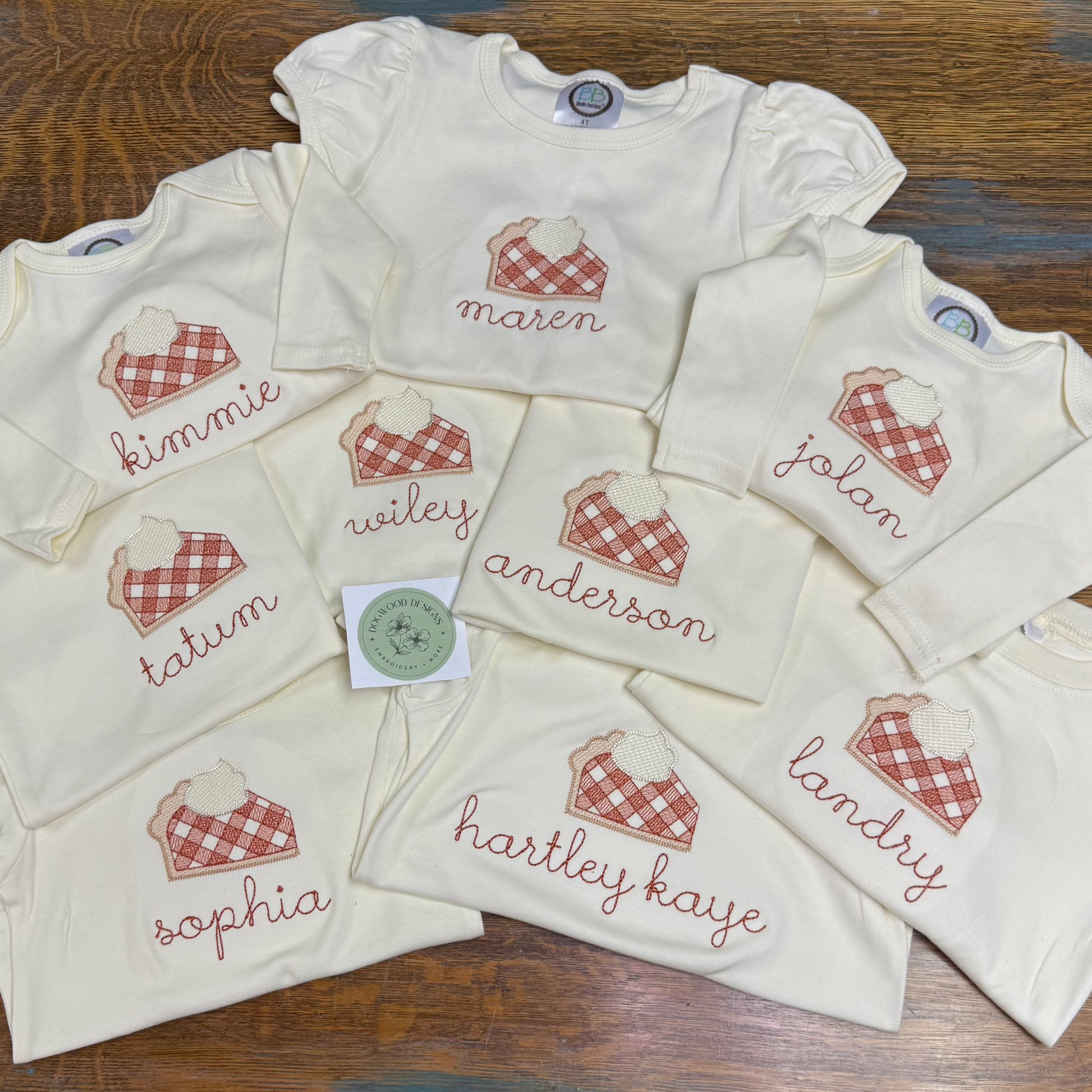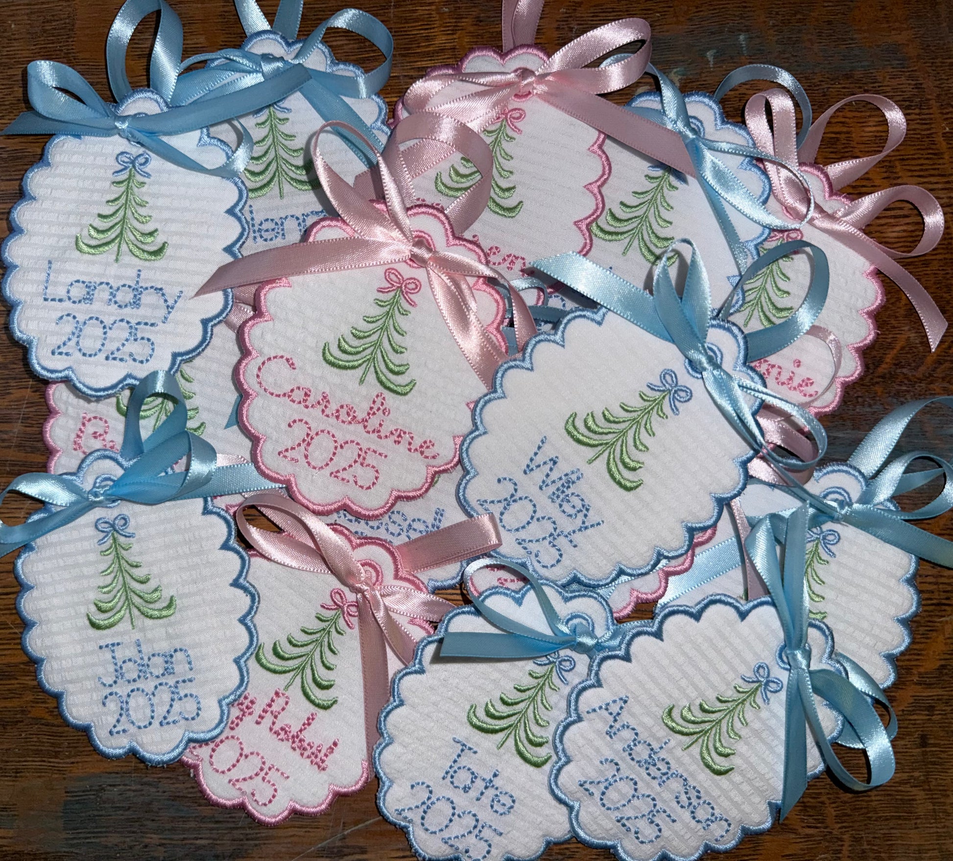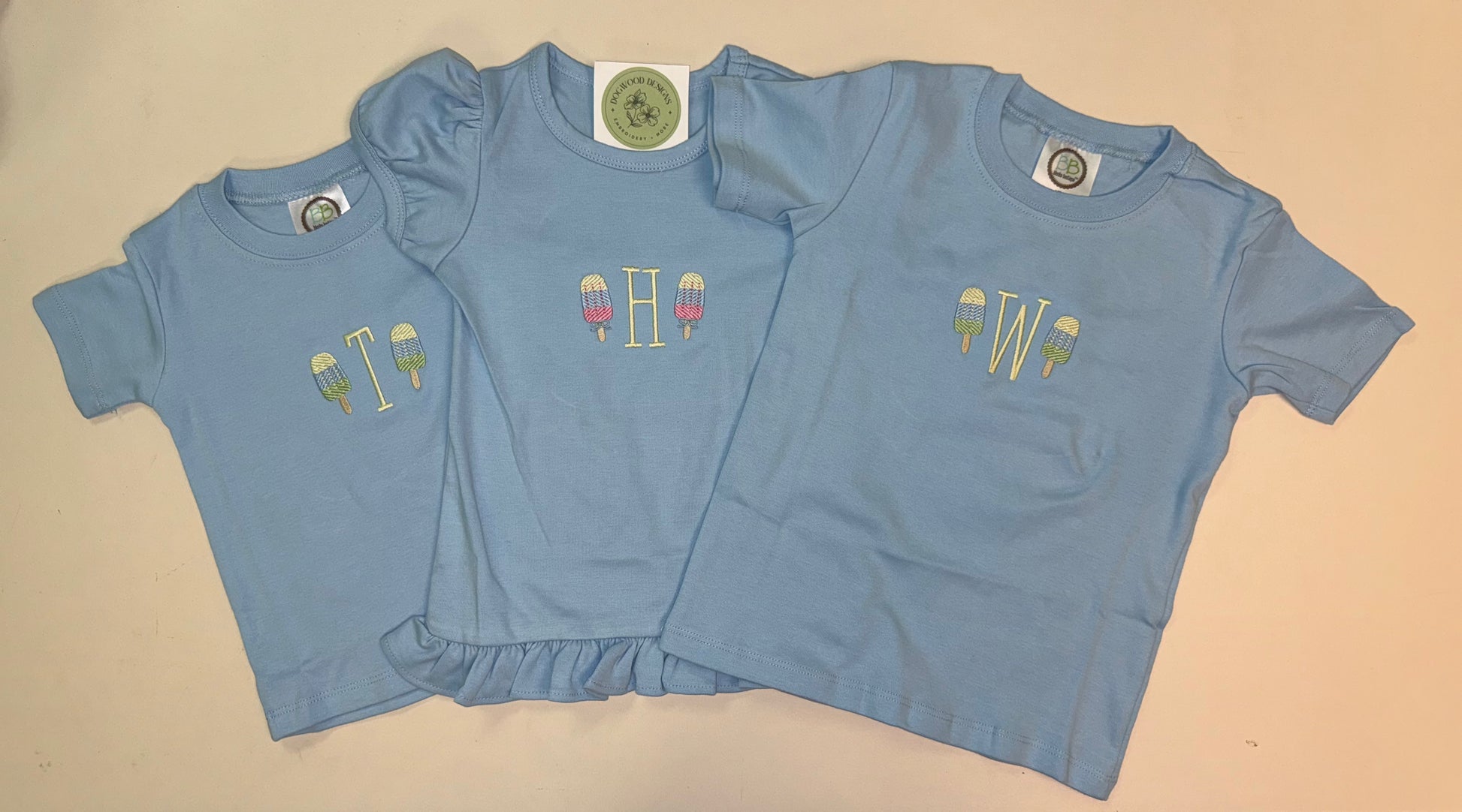 Most Drops will include a t-shirt, but others may feature a seasonal item like a towel, ornament, etc. All orders are custom embroidered at our warehouse in Vicksburg, MS. Seasonal designs may be included throughout the year. When applicable, these items will be delivered at least one month in advance to allow plenty of time for wear. I try my best to coordinate colors for siblings. Gowns and onesies will be white if the monthly color is not available.